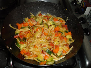 Basicamente podem pegar nos vegetais que têm no frigorifico (pimento, cenoura, courgette...), cortar e meter no wok. E depois juntar atum, bacon, frango, marisco, o que quiserem, e deixar apurar. Evidentemente, que quando for bacon ou frango, será a primeira coisa a colocar no wok para refogar e só depois se junta os vegetais.