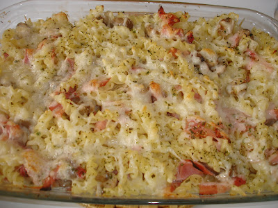 Mistura-se a massa cozida com os cogumelos, o fiambre e o bacon num pirex.